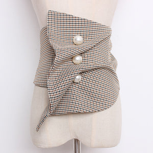 Irregular Plaid Printed Pearled Nailed Irregular Stitch Wide Belt